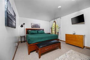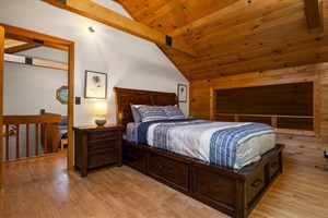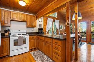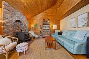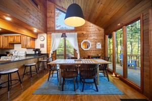 Step inside the cabin, and you'll find a thoughtfully designed interior that harmoniously blends rustic charm with modern comfort. The centerpiece is the wood-burning fireplace, where you can curl up with a good book or enjoy intimate conversations. The spacious living area invites you to relax, while the kitchen and dining areas provide everything you need to prepare home-cooked meals for a cozy night in, as well as games, puzzles, and more to enjoy.